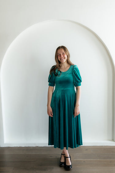 This beautiful velvet dress features a removable sash, puff sleeves and a round neck line.